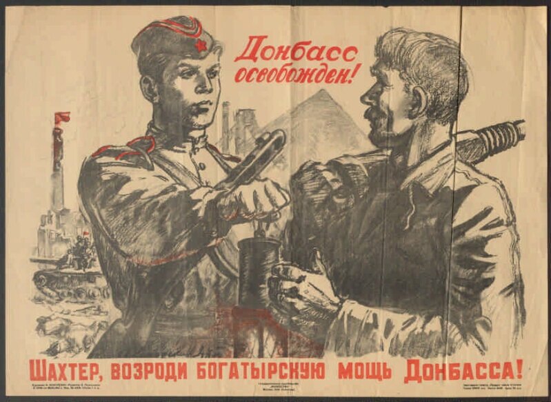 И сегодня Красная Армия разбила оковы великана, и Донбасс воскрес для новой, прекрасной жизни. Слава Донбассу, слава его освободителям! //Н.Тихонов.