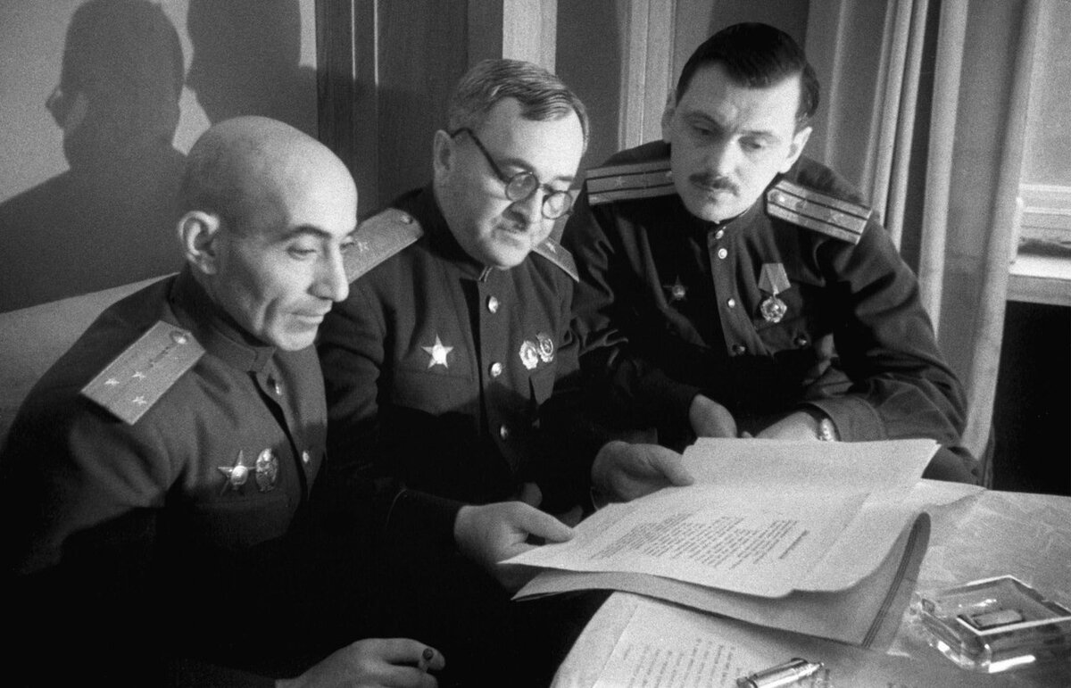 Многотысячное «ypa!» разносится над рекой, горами, степью в честь Верховного Главнокомандующего Маршала Советского Союза товарища Сталина.